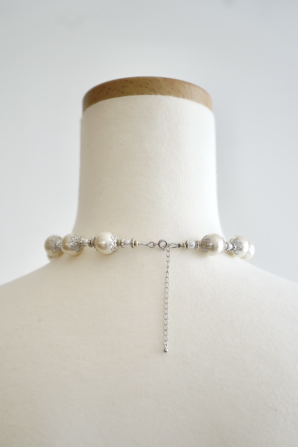 大きめのパールビーズとメタルパーツを施したネックレス。