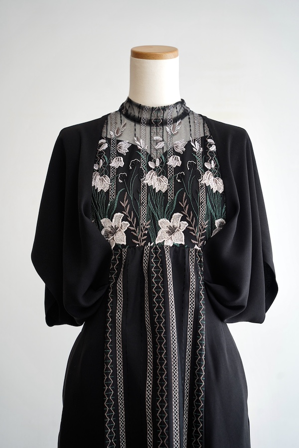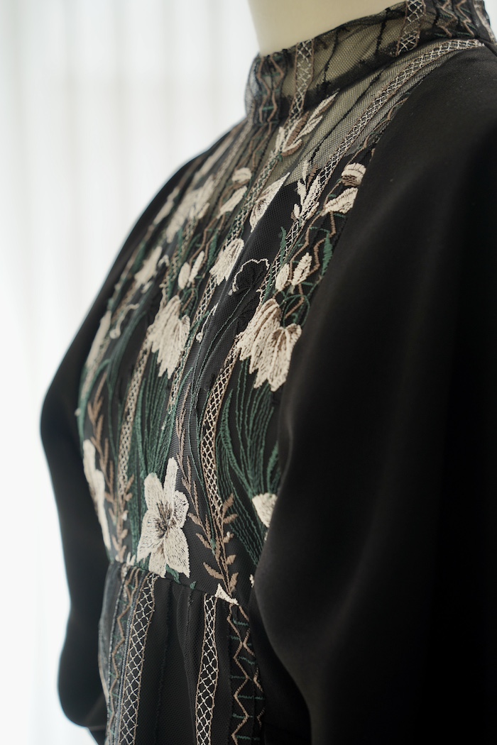 - ドレープから生み出される蕾のようなカッティングのケープショルダーが特徴的なレースドレス。