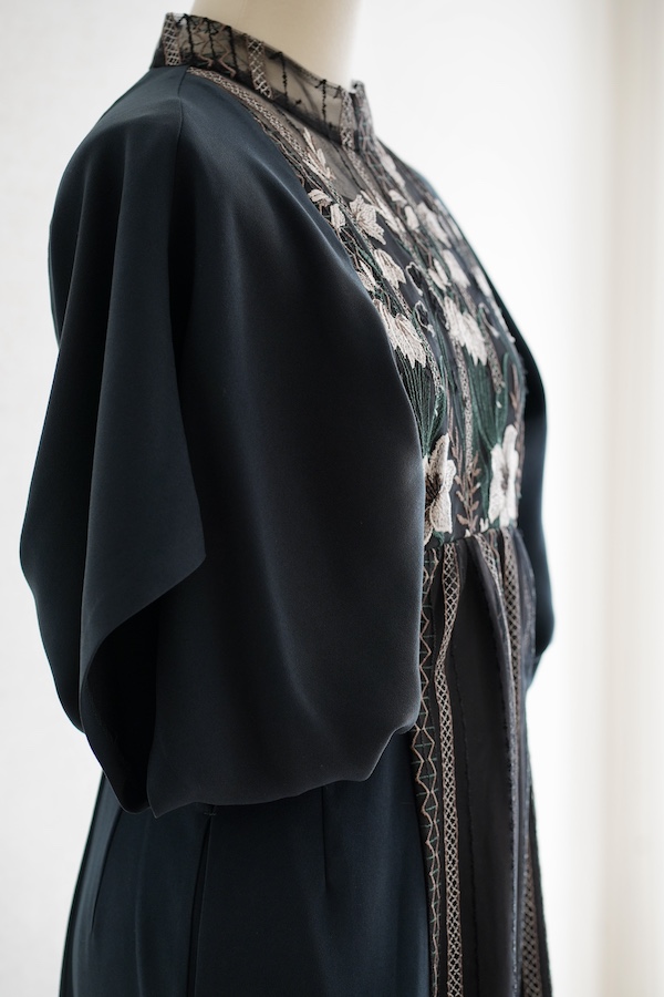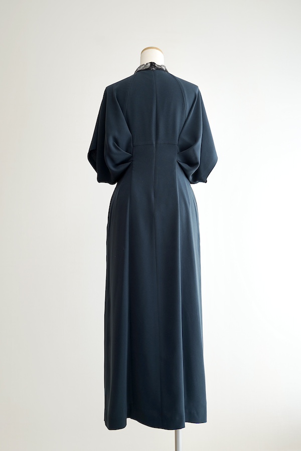 - ドレープから生み出される蕾のようなカッティングのケープショルダーが特徴的なレースドレス。ドレスには珍しいダークグリーンのような綺麗なお色です。