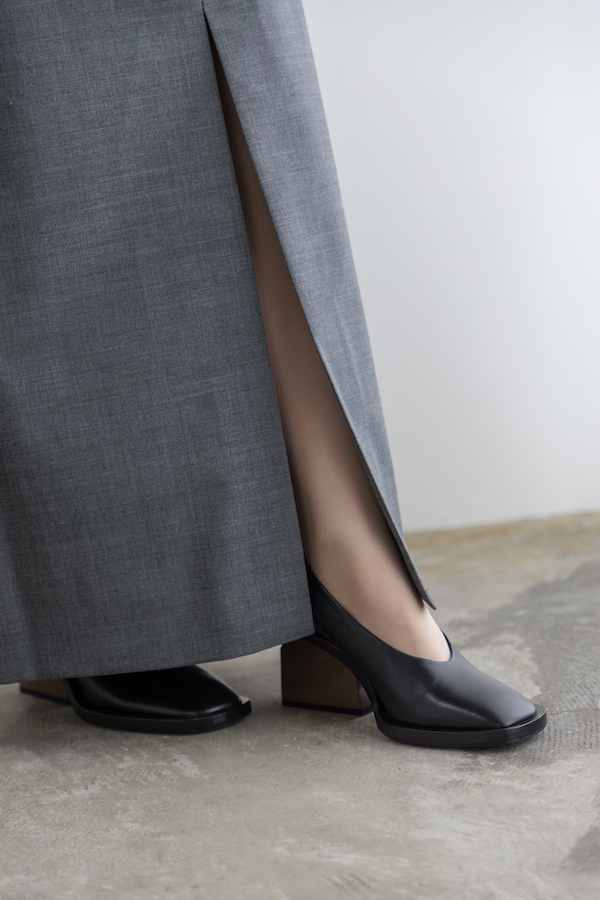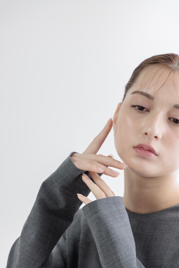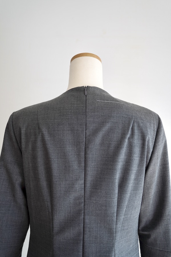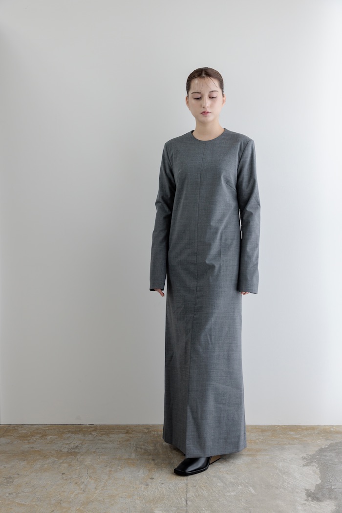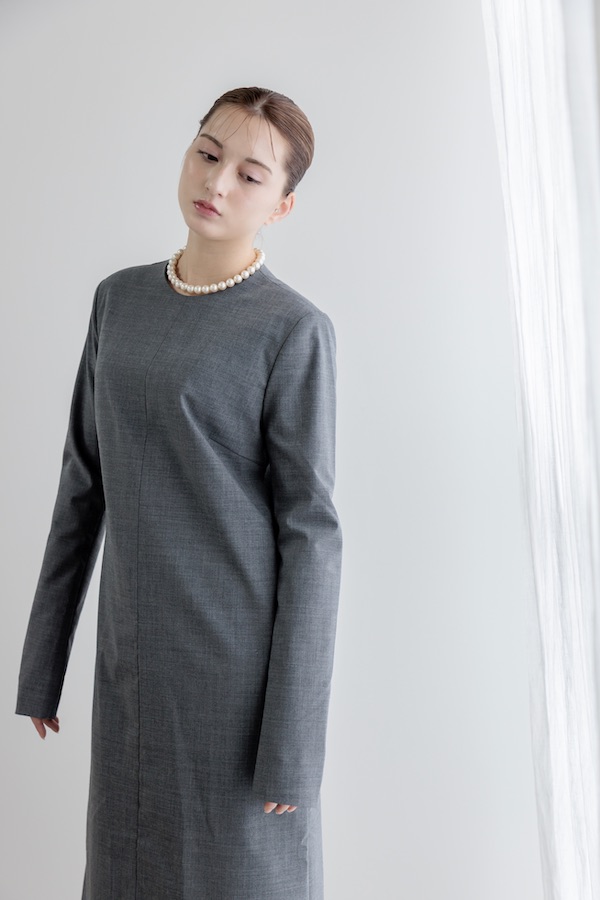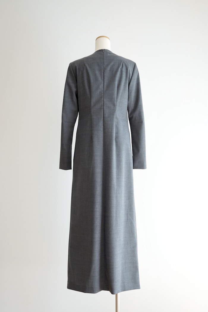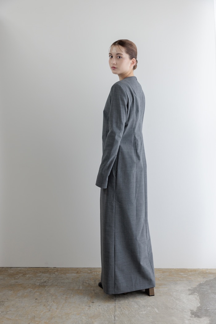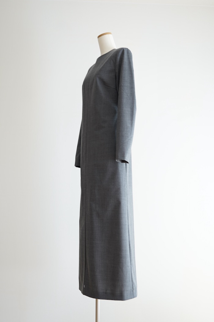 - ミニマムなデザインに、深めに入った前面スリットや長めの袖丈、軽やかなグレー色が洗練された印象を与える一着です。