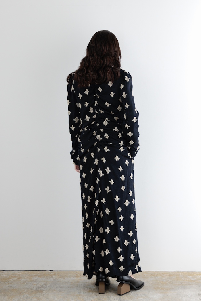 - アシンメトリーにギャザーが入っており、モードな装いでファッション性が高く、独特の存在感を放ちます。