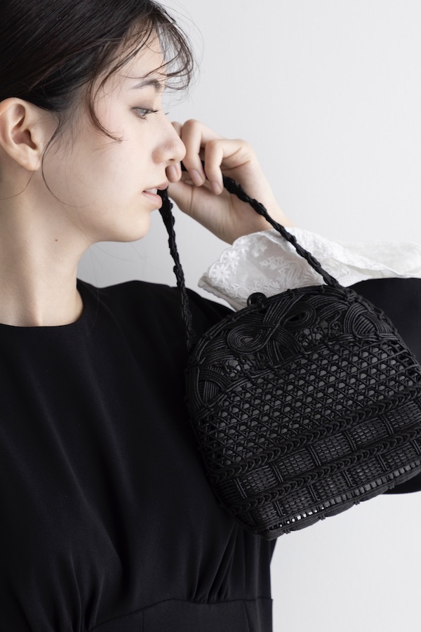 - 竹籠を編むようにコード刺繍で作られたミニハンドバックです。
