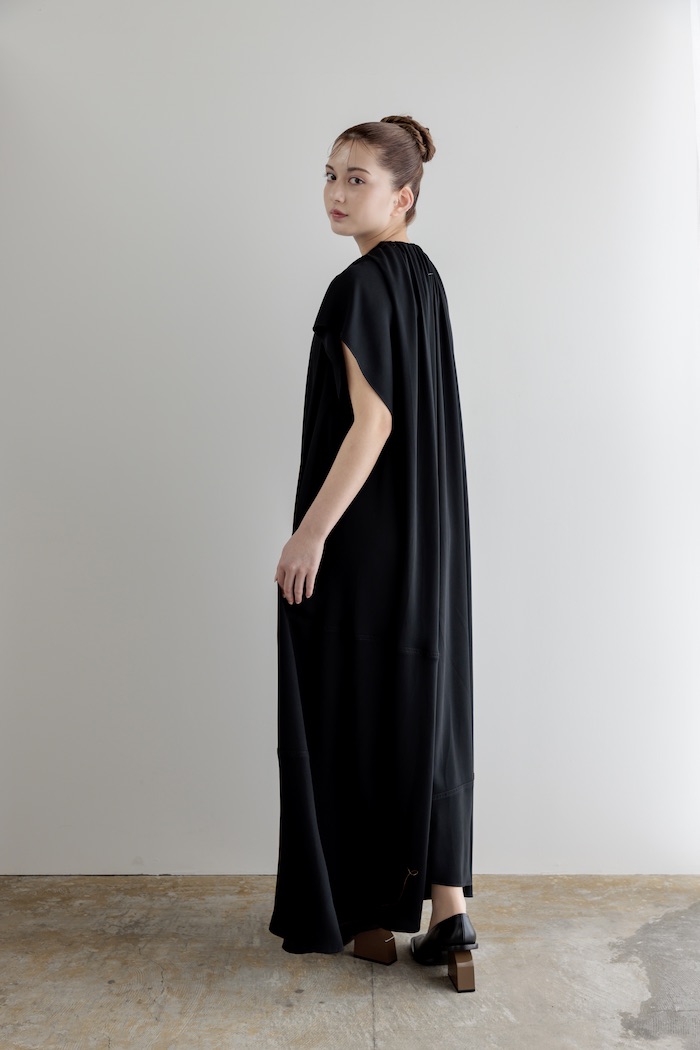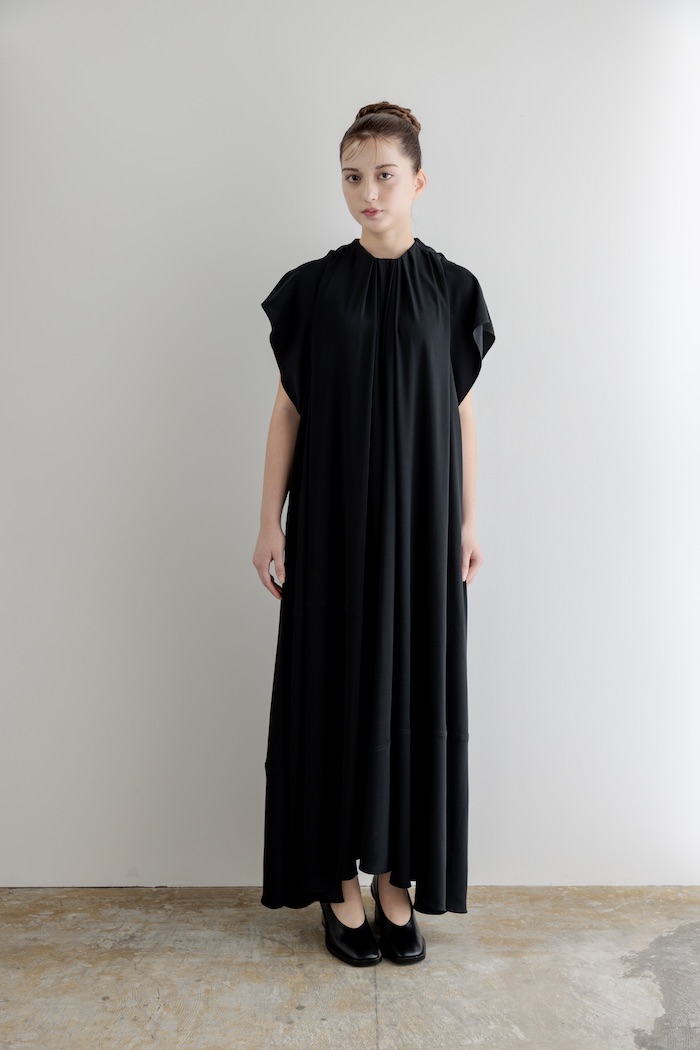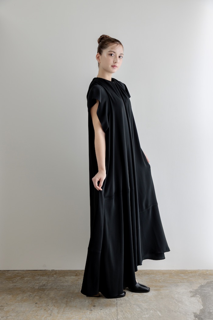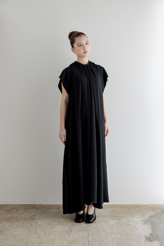 - 肩が隠れる短めのキャップスリーブと、アシンメトリーな裾が特徴的なデザインとなっています。