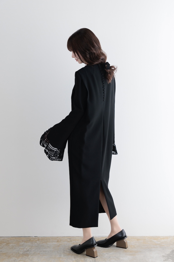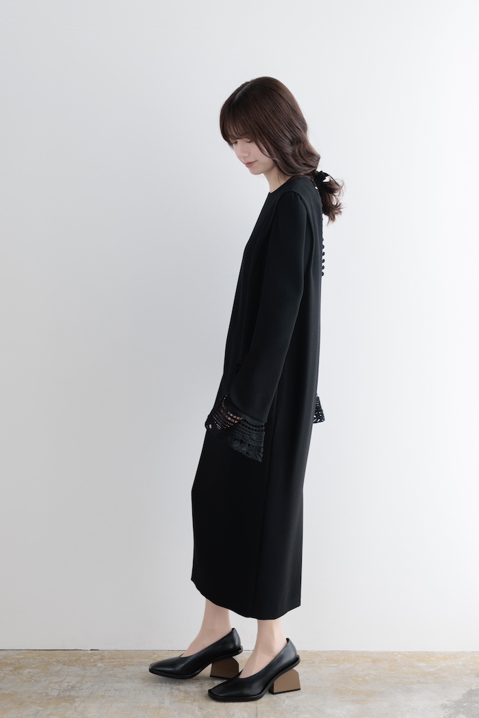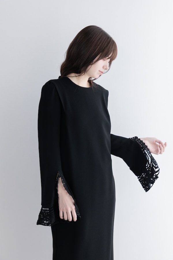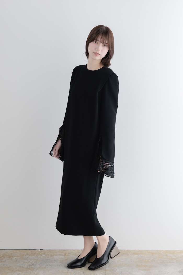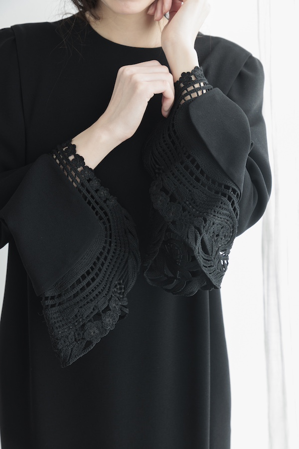 クラシカルなシルエットと袖のレースカフスが印象的なクルーネックドレス。