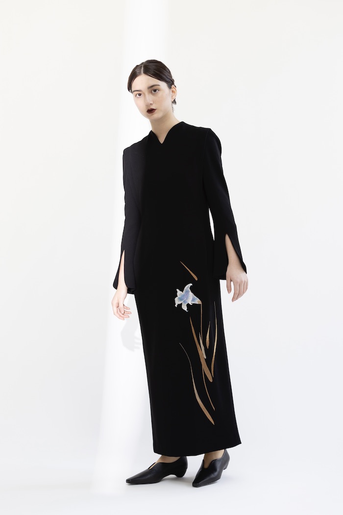 Mame Kurogouchi(3泊4日) Back Satin Crepe Georgette Embroidered Cuffs I-Line Dress